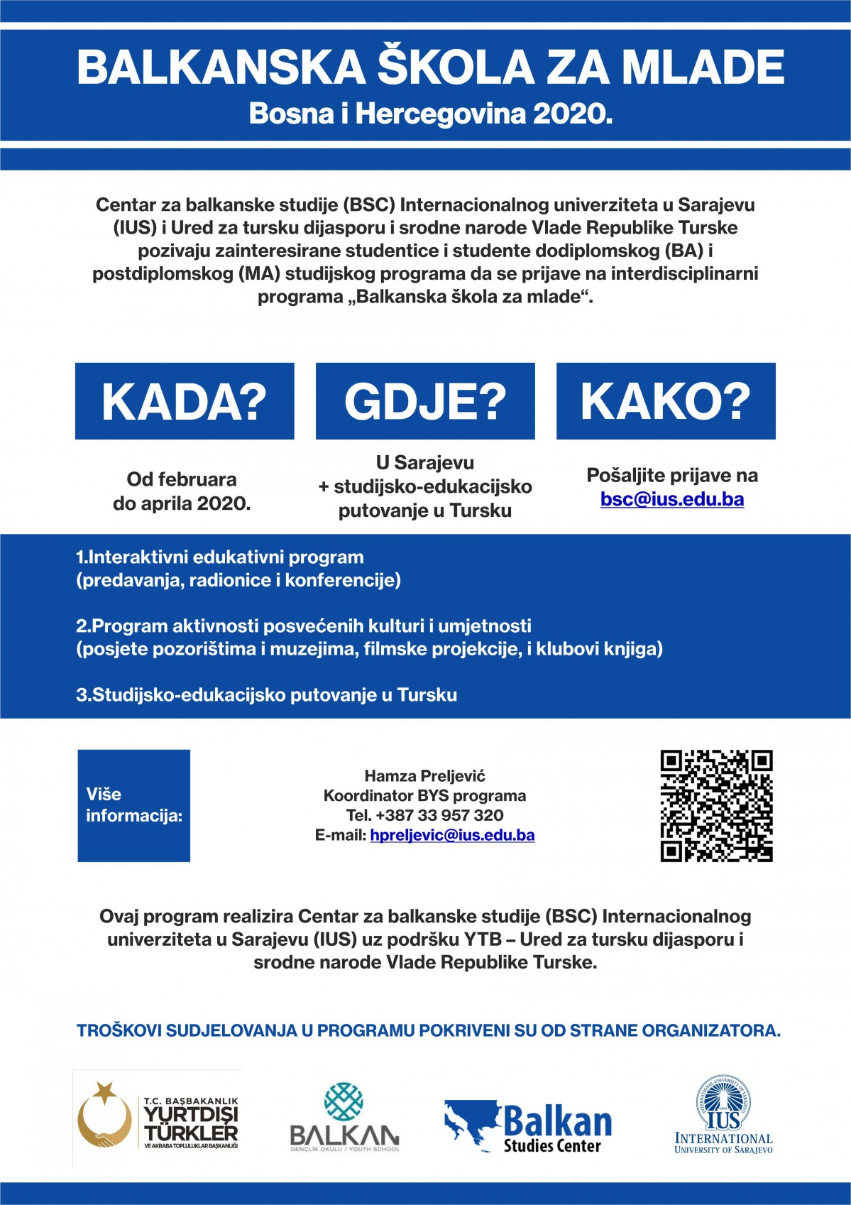Centar za balkanske studije (BSC) Internacionalnog univerziteta u Sarajevu (IUS) i Ured za tursku dijasporu i srodne narode Vlade Republike Turske pozivaju zainteresirane studentice i studente dodiplomskog (BA) i postdiplomskog (MA) studijskog programa da se prijave na interdisciplinarni programa „Balkanska škola za mlade“.