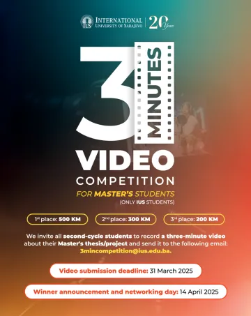 International University of Sarajevo (IUS) invites all Master's students to participate in an exciting 3-minute video competition! Share your thesis or project in a compelling video and compete for cash prizes! 🏆 Awards: 🥇 1st place: 500 KM