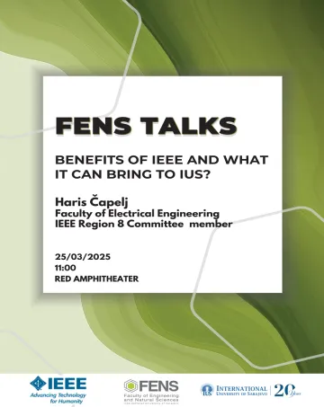 The Faculty of Engineering and Natural Sciences (FENS) is organizing an event for FENS professors, assistants and students who would like to learn more about the benefits of IEEE.The guest lecturer is Mr. Haris Čapelj from the Faculty of Electrical Engineering and member of the IEEE Region 8 Committee.