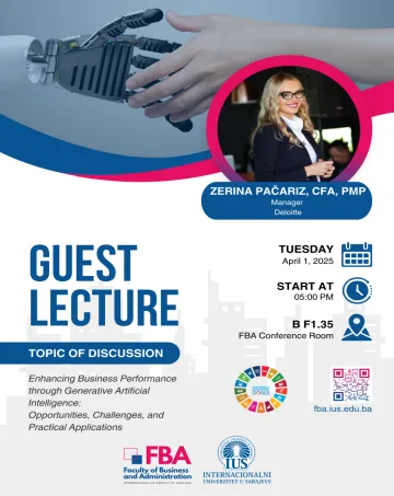 The Faculty of Business and Administration (FBA) is organizing a lecture titled "Enhancing Business Performance through Generative Artificial Intelligence: Opportunities, Challenges, and Practical Applications." The guest lecturer will be Ms. Zerina Pačariz, CFA, PMP, Manager at Deloitte.
