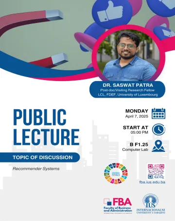 The IUS Faculty of Business and Administration (FBA) is organizing a public lecture titled "Recommender Systems". The guest lecturer is Dr. Saswat Patra, Post-doc/Visiting Research Fellow, LCL, FDEF.
