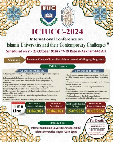 ICIUCC 2024 - International Conference on Islamic Universities and their Contemporary Challenges   Deadline for Abstract Submission: June 1, 2024   Conference Date: October 21-23, 2024 Venue: Permanent Campus of International University Chittagong, Bangladesh