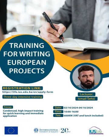 Pridružite nam se na sveobuhvatnim treninzima koje vodi iskusni stručnjak iz prakse, osmišljen da vas i vaš tim opremi vještinama i alatima potrebnim za pisanje složenih evropskih projektnih prijava! Datumi: 02.10.2024.-04.10.2024. Vrijeme: 10:00-16:00 Kotizacija: 600KM (uključen PDV i ručak) Predavač: Ismail Šehić