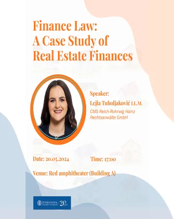 The guest speaker is Ms. Lejla Tuholjaković, LL.M., CMS Reich-Rohrwig Hainz Rechtsanwalte GmbH, Vienna, Austria, who will talk about financing, standards, Loan Market Association (LMA), challenges and solutions in this field of law.