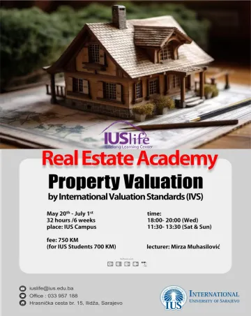 Procjena vrijednosti nekretnina prema Međunarodnim računovodstvenim standardima (IVS) pruža opsežnu i profesionalnu edukaciju i dio je programa koji ima za cilj da upozna polaznike sa tržištem nekretnina, procjenama, planiranjem i razvojem u ovoj atraktivnoj oblasti.