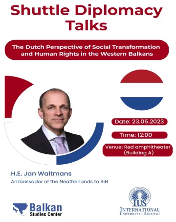 We cordially invite you to: Shuttle Diplomacy Talks: The Dutch Perspective of Social Transformation and Human Rights in the Western Balkans Date: 23.05.2023 Time: 12:00  Venue: IUS Main Amphitheater (Building A) Speaker: H.E. Jan Waltmans, ambassador of the Netherlands to Bosnia and Herzegovina