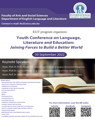 U petak, 30. septembra 2022. godine, studijski program Engleski jezik i književnost će održati drugu ELIT konferenciju mladih 2022 pod naslovom: Konferencija mladih o jeziku, književnosti i obrazovanju: Udružimo snage da izgradimo bolji svijet.