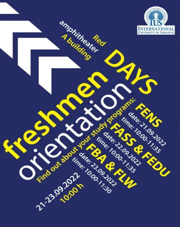 We kindly invite our freshmen who are starting courses this semester to join us on September 21, 22 and 23, 2022 and learn more about their study programs, our offices, and the University.   For more details, check the poster   We are looking forward to welcoming our new students at IUS. See you at the campus!