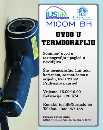 IUS Life - Centar za cjeloživotno učenje Internacionalnog univerziteta u Sarajevu (IUS) i Micom BH Sarajevo vas pozivaju da prisustvujete seminaru Uvod u termografiju - pogled u nevidljivo. Termografija je beskontaktna metoda mjerenja temperature i njezine raspodjele na površini tijela. Šta termografiju čini tako korisnom, saznat ćemo u četvrtak, 07.07.2022.
