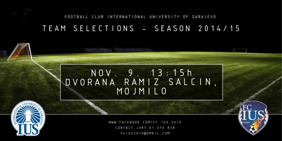 Fudbalski klub IUS-a vas obavještava da će se održati selekcija fudbalskog tima IUS-a 09.11.2014. godine u dvorani "Lokum" na Mojmilu (preko puta Fahdove džamije), sa početkom u 13:15 sati.