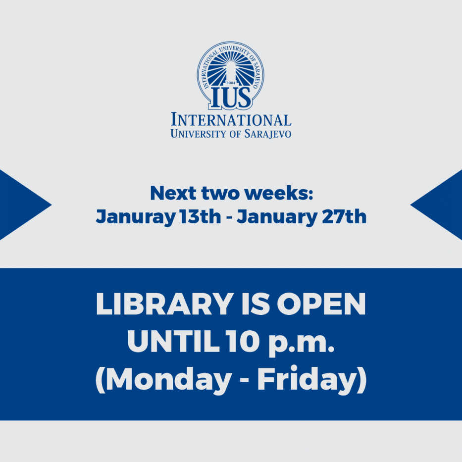 During the next 2 weeks, January 13th - January 27th, 2020, (Monday to Friday), IUS Library will be open until 10 pm.