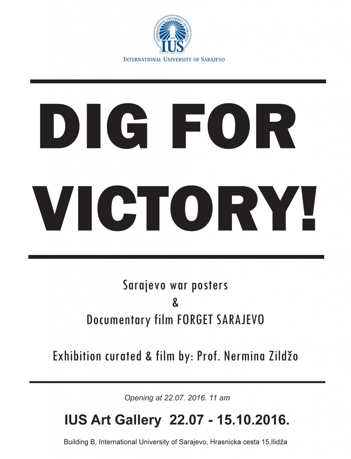 “Dig for Victory” is the title of the exhibition of war posters 1992-1995 collected during the siege of Sarajevo which was supplemented by the documentary “Forget Sarajevo”. The poster exhibition was organized during the war and shown for the first time in the Art Gallery of Bosnia and Herzegovina in 1993. Later on, the exhibition was supplemented by exhibiting material and displayed under the auspices of Jacques Chirac in Paris in 1994. In addition, the exhibition was a part of the large project of posters from the First World War and Second World War at Hood Museum in Hanover – NH, USA, in 1996.