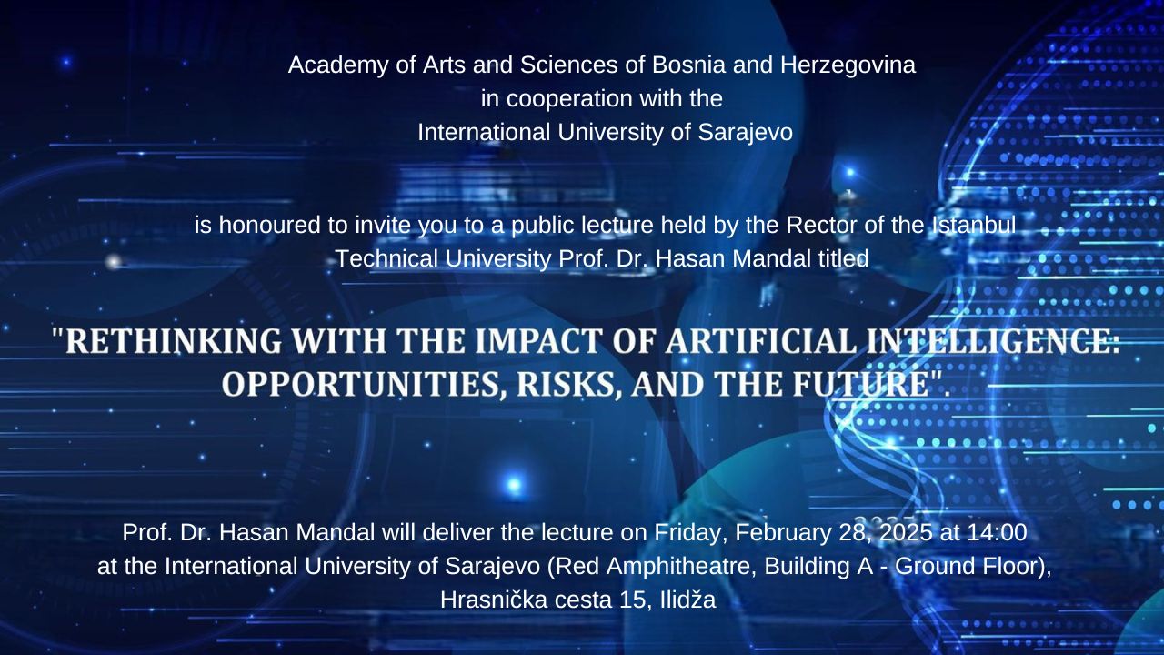The Academy of Arts and Sciences of Bosnia and Herzegovina, in collaboration with the International University of Sarajevo (IUS), is pleased to invite you to a public lecture titled “Rethinking with the Impact of Artificial Intelligence: Opportunities, Risks, and the Future”.
