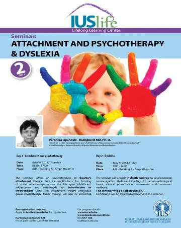A two days seminar for psychologists titled "Attachment and Psychotherapy & Dyslexia " will be held at the International University of Sarajevo in the period between May 8th and May 9th, 2014. The seminar is intended for psychologists, psychology students and all other interested persons who are eager to learn more about those topics.