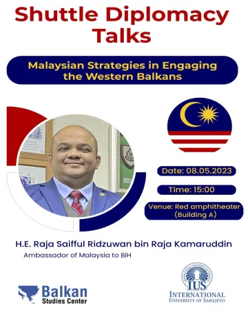 We would like to cordially invite you to:   Shuttle Diplomacy Talks: Malaysian Strategies in Engaging the Western Balkans Date: May 08, 2023 Time: 15:00 Venue: IUS Main Amphitheater (Building A) Speaker: H.E. Raja Saifful Ridzuwan bin Raja Kamaruddin, ambassador of Malaysia to Bosnia and Herzegovina