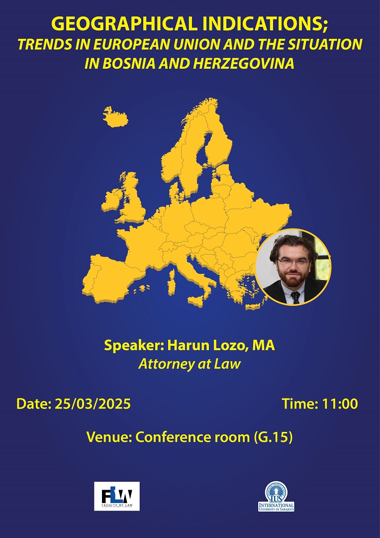 The IUS Faculty of Law (FLW) is pleased to invite you to an engaging event on Geographical Indications: Trends in the European Union and the Situation in Bosnia and Herzegovina. Our distinguished guest speaker, Mr. Harun Lozo, MA, Attorney at Law, will share valuable insights on this important subject.