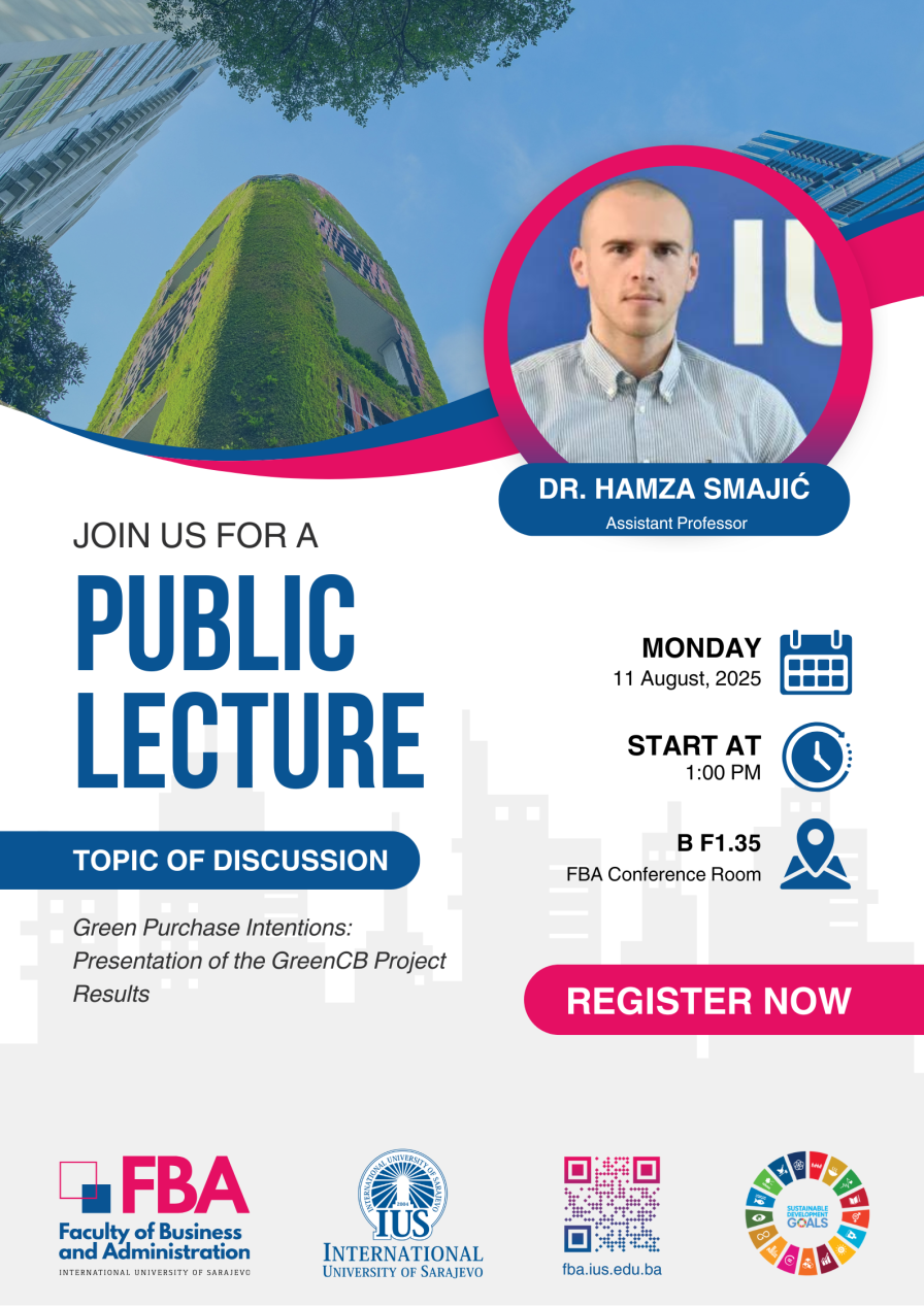 The IUS Faculty of Business and Administration (FBA) is pleased to invite you to a public lecture titled: "Green Purchase Intentions: Presentation of the GreenCB Project Results"