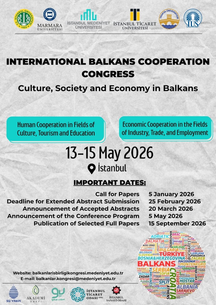 The "International Balkans Cooperation Congress", organized in collaboration with Istanbul University, Istanbul Medeniyet University, Istanbul Ticaret University, Marmara University, and Trakya University, will be held on May 13–15, 2026, hosted by Istanbul Ticaret University.