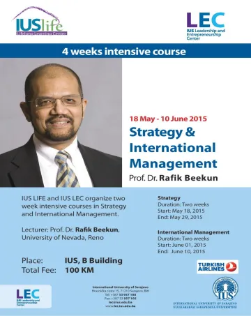 4 weeks intensive courseStrategy & International Management18 May - 10 June 2015Prof. Dr. Rafik BeekunIUS LIFE and IUS LEC organize two week intensive courses in Strategy and International Management. Lecturer: Prof. Dr. Rafik Beekun, University of Nevada, Reno